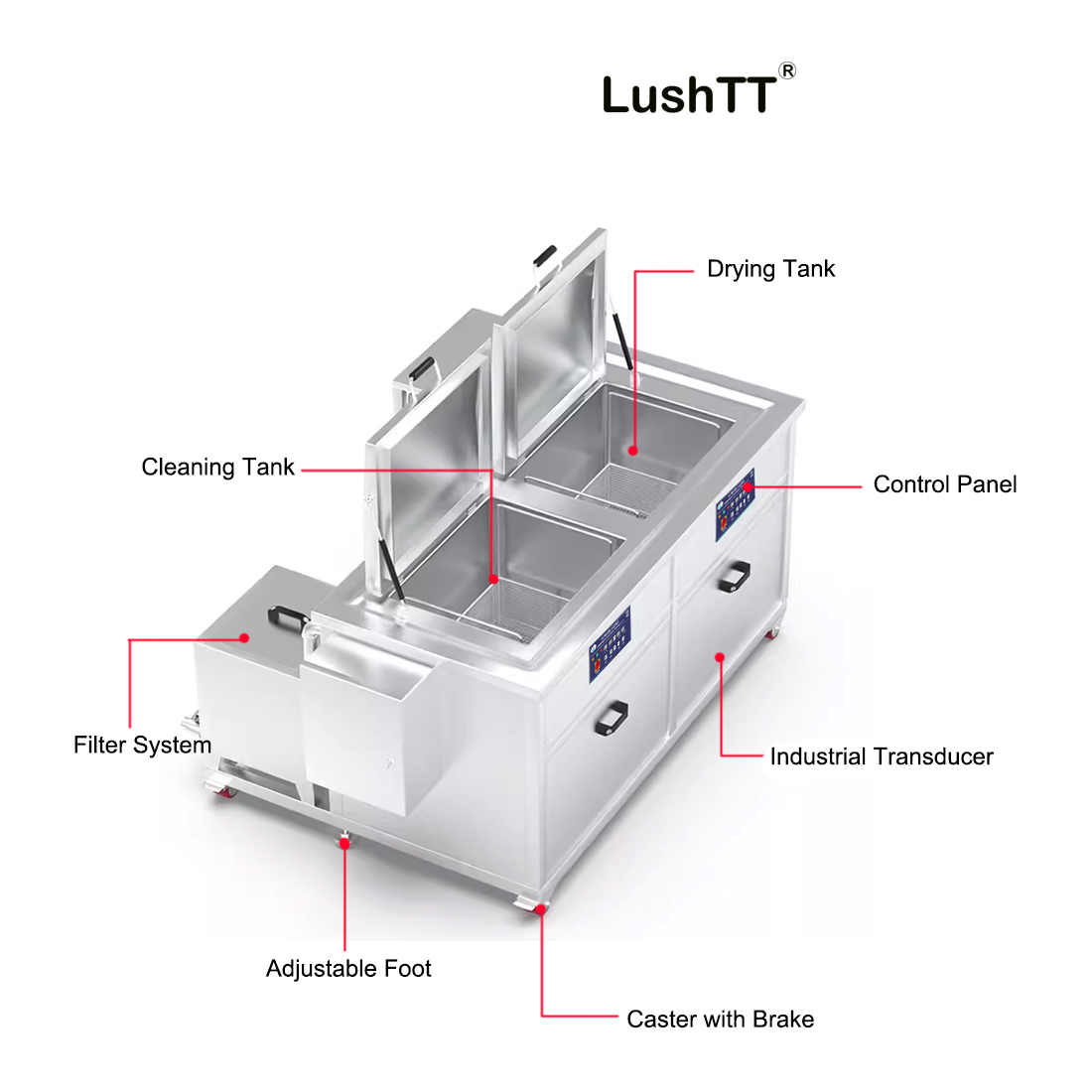 1. The 1st tank: Ultrasonic Cleaning+filtration with circulation sub-tank, the 2nd tank: Drying.