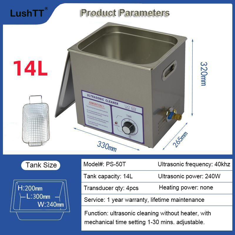 1. Tank capacity: 14L, tank size: L300*W240*H200mm, product Size: L330*W265*H320mm, package Size: L420*W360*H420mm, ultrasonic power: 240W, transducer quantity: 4pcs, frequency: 40khz, with mechanical control timer.