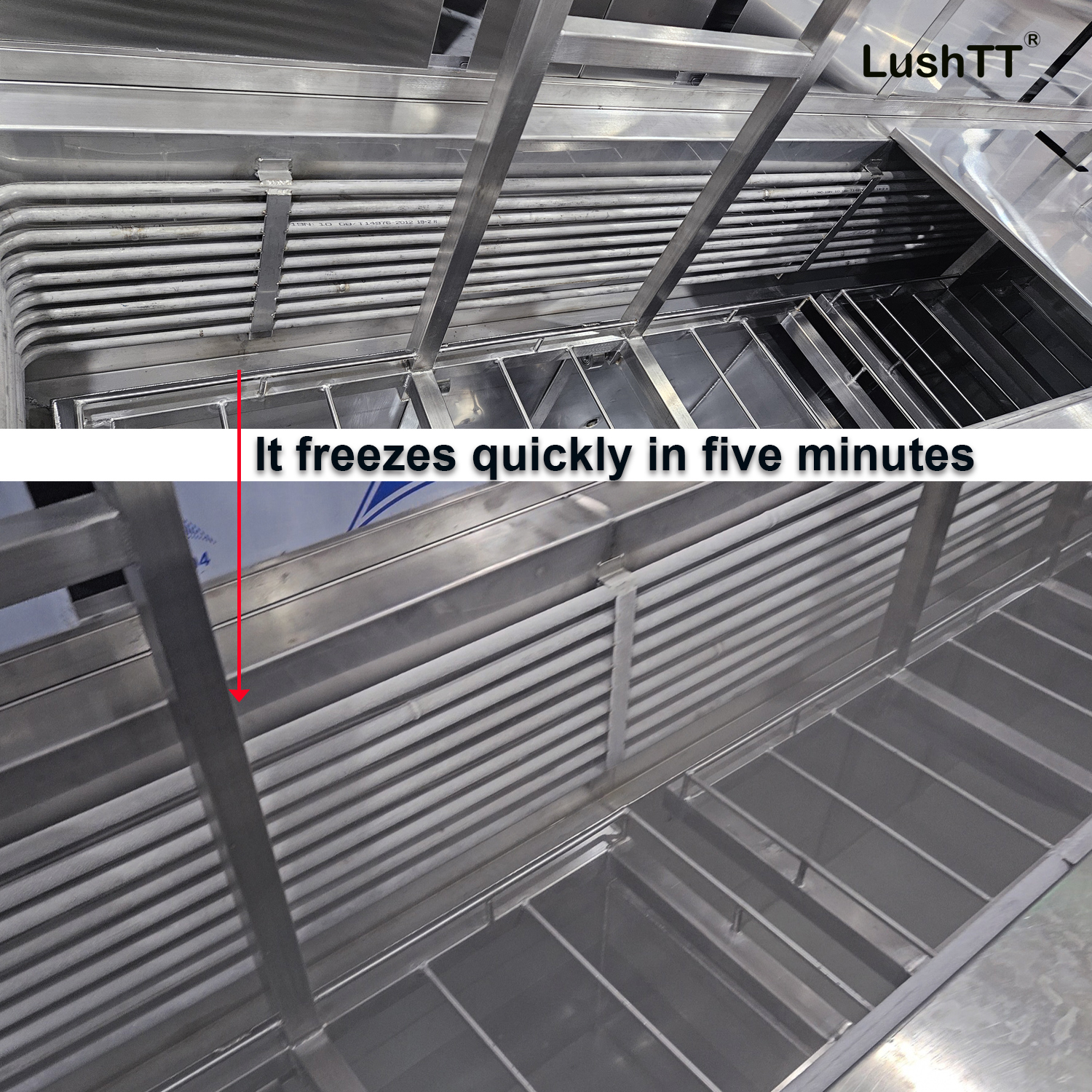 5. Freezing system: The machine adopts two-stage freezing system, the first layer is the freezing zone, connected with the freezing system. Another layerisfor the cold water frozen zone, access to cold water frozen. Equipped with chiller and cooler 1 set each, multi-stage working shares these refrigeration system.