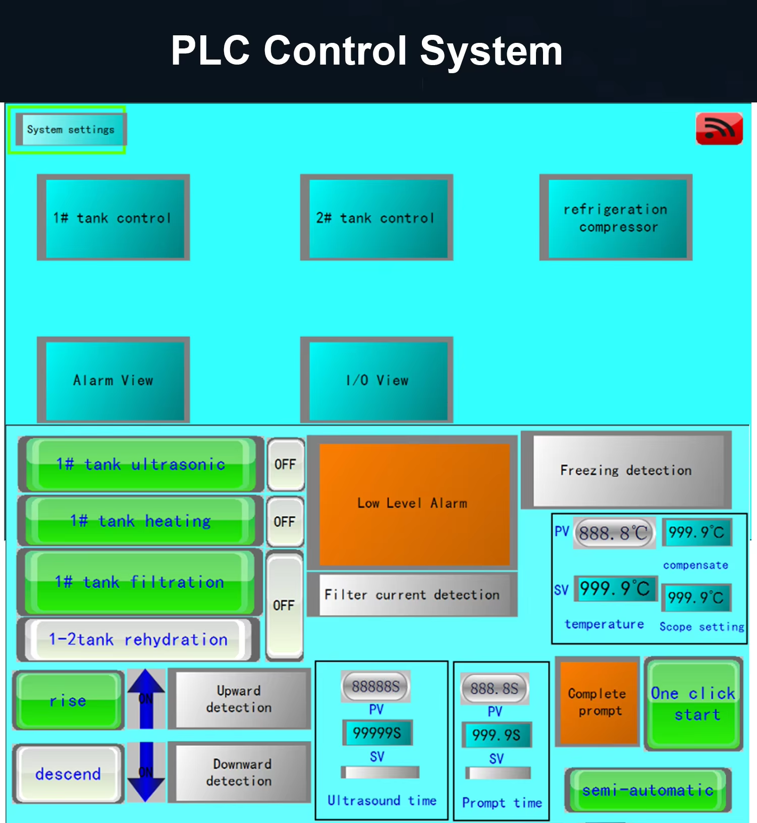 5): Heating system: a 6KW cast aluminum alloy heating plate is installed on the side wall of each 1# and 2# working tank. And a digital temperature controller controls the heating temperature.