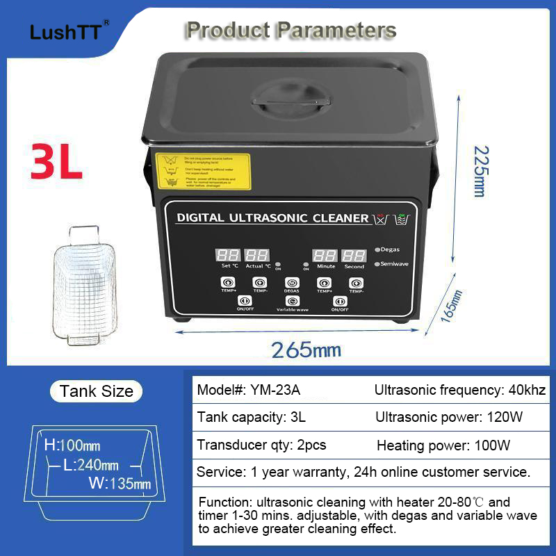 1. Tank capacity: 3L, tank size: L240*W135*H100mm, product Size: L265*W165*H225mm, package Size: L343*W187*H300mm, heating power: 100W, ultrasonic power: 120W, frequency: 40khz, with digital control timer and heater.