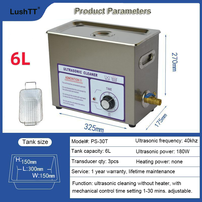 1. Tank capacity: 6L, tank size: L300*W150*H150mm, product Size: L325*W175*H270mm, package Size: L420*W270*H365mm, ultrasonic power: 180W, transducer quantity: 3pcs, frequency: 40khz, with mechanical control timer.