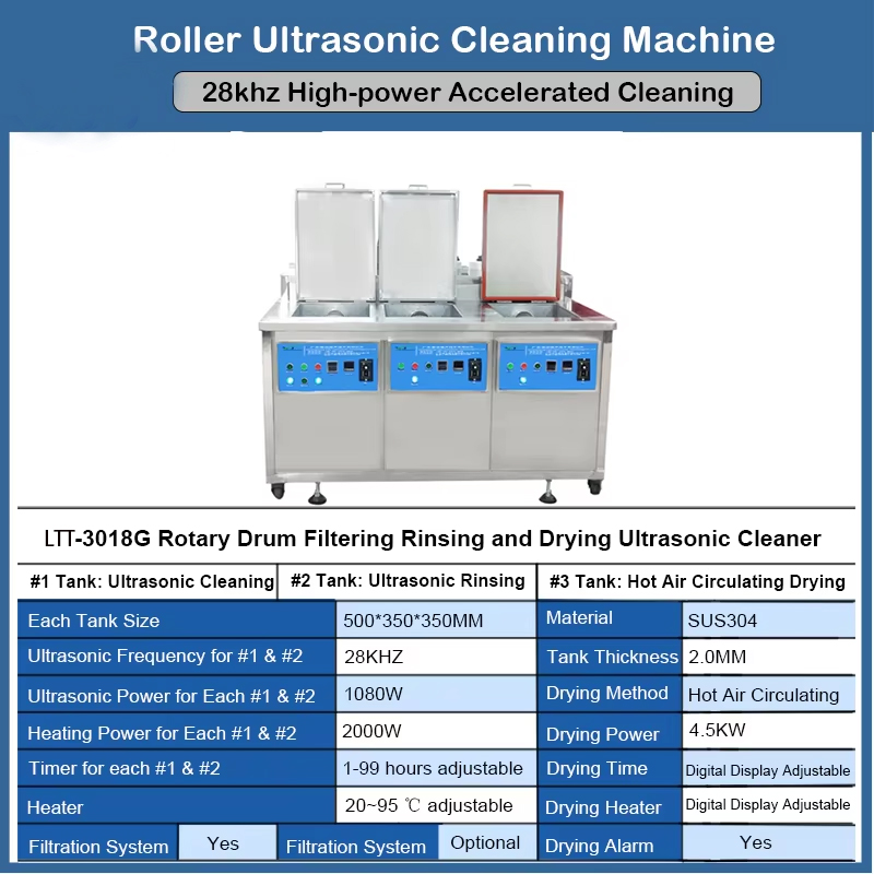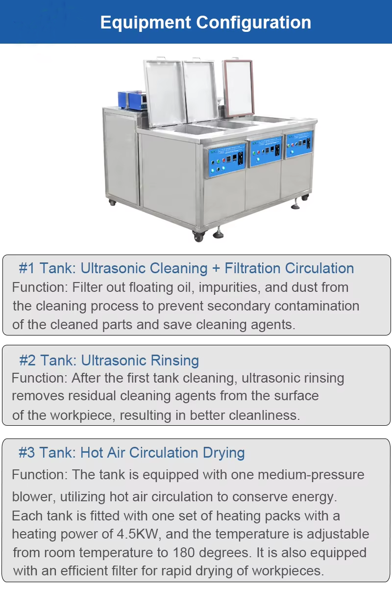 #1 Tank: Ultrasonic Cleaning + Filtration Circulation Function: Filter out floating oil, impurities, and dust fromthe cleaning process to prevent secondary contamination of the cleaned parts and save cleaning agents.