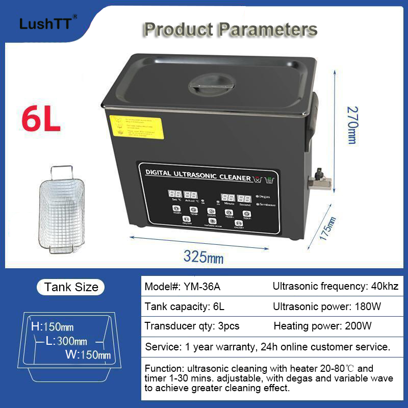 1. Tank capacity: 6L, tank size: L300*W150*H150mm, product Size: L325*W175*H270mm, package Size: L420*W270*H365mm, heating power: 200W, ultrasonic power: 180W, frequency: 40khz, with digital control timer and heater.