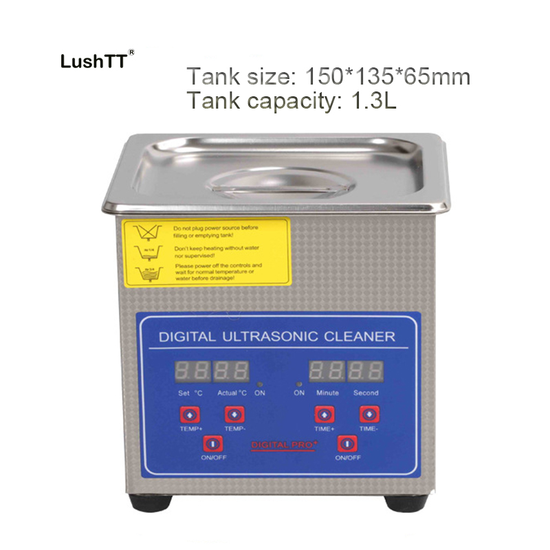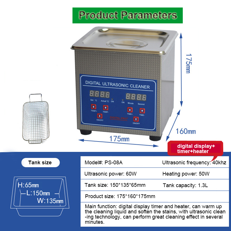 1. Tank capacity: 1.3L, tank size: L150*W135*H65mm, product Size: L175*W160*H175mm, package Size: L220*W190*H225mm, heating power: 50W, ultrasonic power: 60W, frequency: 40khz, with digital control timer and heater.