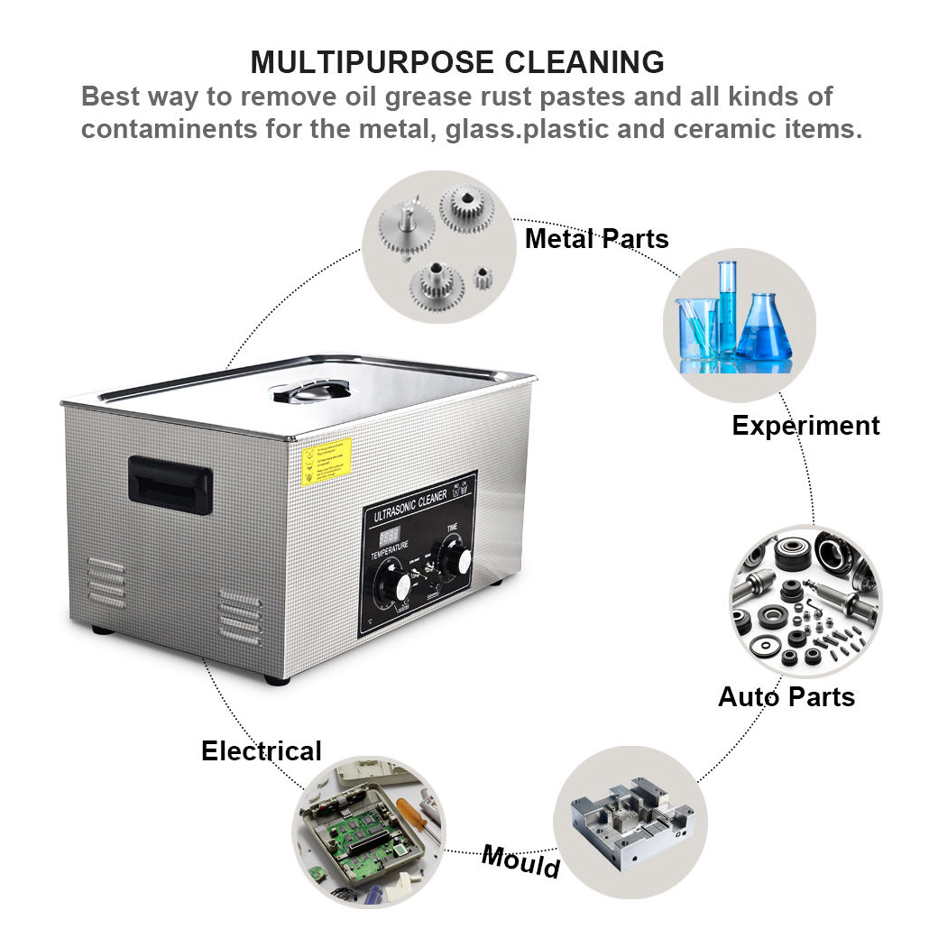 12. Practical Application: This ultrasonic cleaner,with excellent appearance, performance and special capacity design, is widely used for cleaning auto parts, engine blocks, and various metal components and parts, FCC / CE / RoHS / UL Certified.