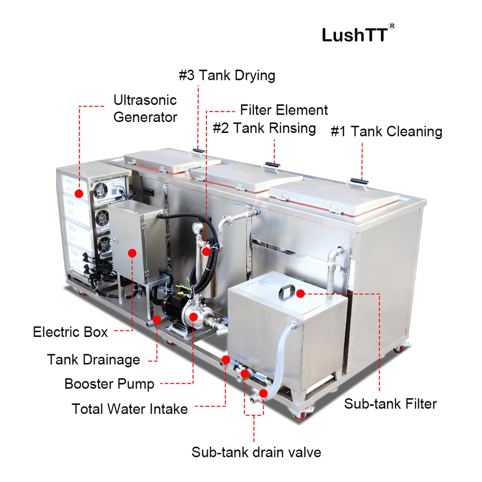2. Tank function: 1st tank ultrasonic cleaning+heating+filtration with circulation sub-tank, 2nd tank ultrasonic rinsing+heating, 3rd tank hot air circulation drying.