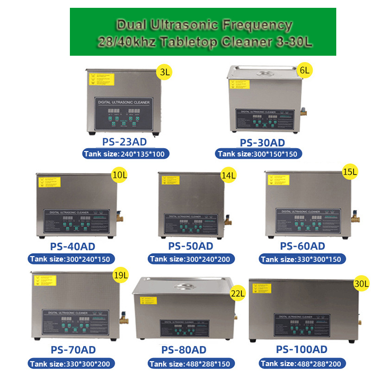 There are many series of tabletop ultrasonic cleaners we produce such as:Digital series, mechanical series, power adjustable series, sweep degas power adjustable series, degas and various wave series, dual-freqency series, three-freqency series., etc. from 3L to 30L.