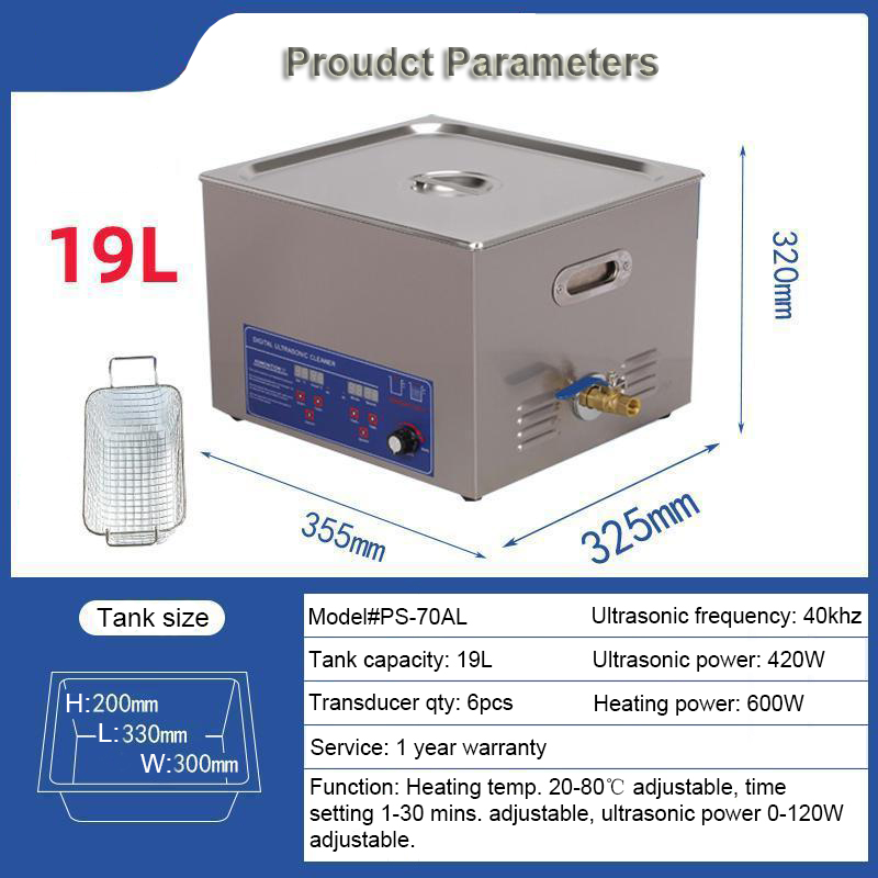 1. Tank capacity: 19L, tank size: L330*W300*H200mm, product Size: L355*W325*H320mm, package Size: L460*W420*H420mm, heating power: 300W, ultrasonic power: 150-360W adjustable, transducer quantity: 6pcs, frequency: 40khz.