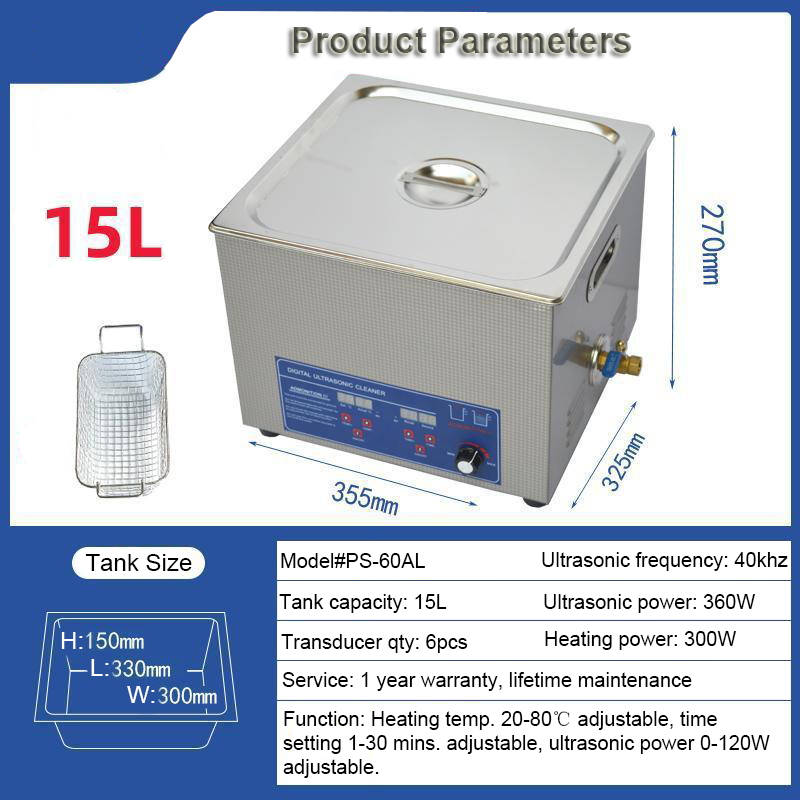 1. Tank capacity: 15L, tank size: L330*W300*H150mm, product Size: L355*W325*H270mm, package Size: L445*W400*H360mm, heating power: 300W, ultrasonic power: 150-360W adjustable, transducer quantity: 6pcs, frequency: 40khz.