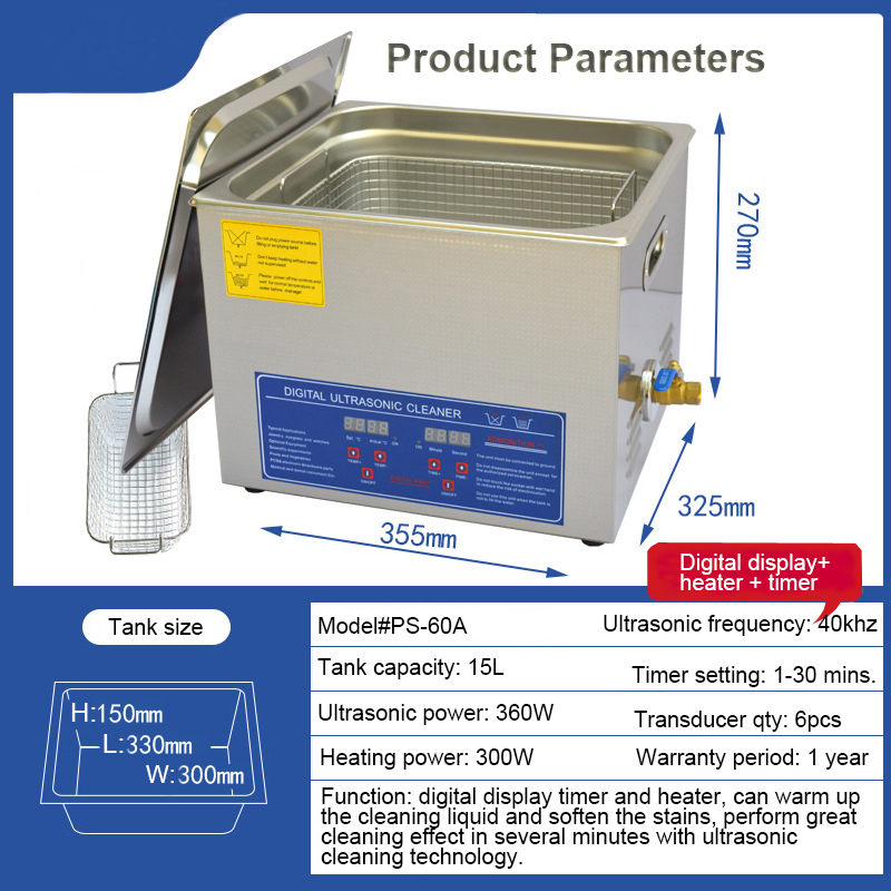 1. Tank capacity: 15L, tank size: L330*W300*H150mm, product Size: L355*W325*H270mm, package Size: L445*W400*H360mm, heating power: 300W, ultrasonic power: 360W, frequency: 40khz, with digital control timer and heater.
