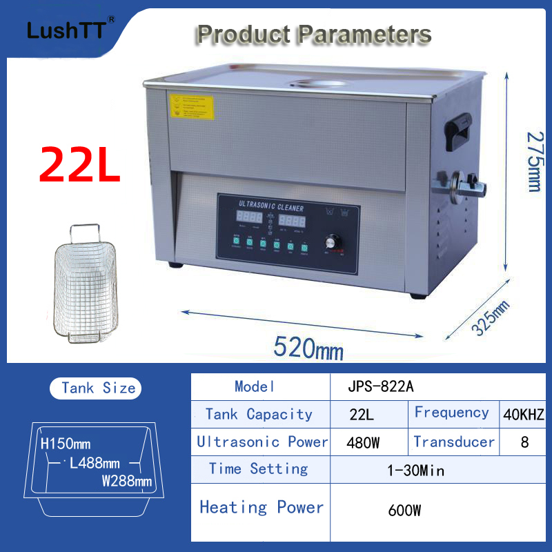 1. Tank capacity: 22L, tank size: L500*W300*H150mm, product Size: L530*W325*H340mm, package Size: L628*W418*H423mm, heating power: 600W, ultrasonic power: 192-480W adjustable, frequency: 40khz, with digital control timer and heater.