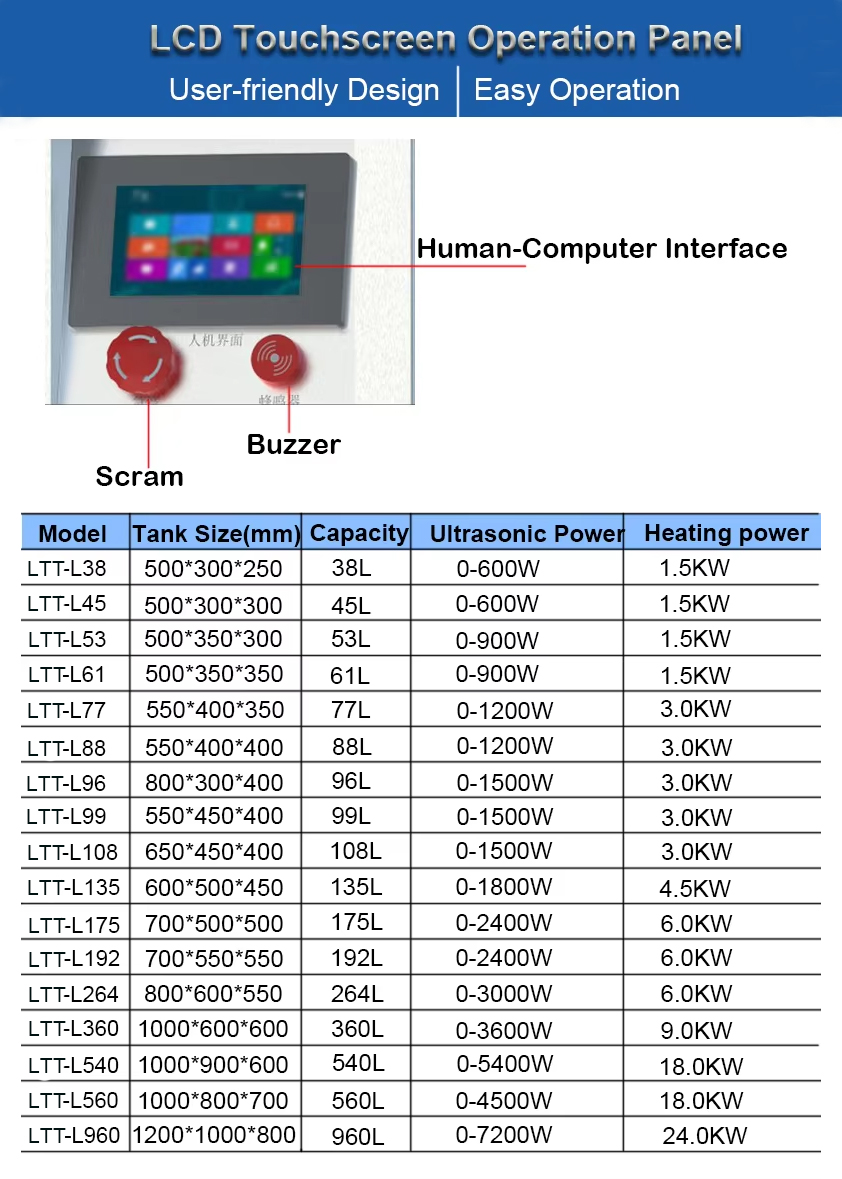3. Ultrasonic power: 900W. Transducer quantity: 18pcs. Heating power: 1.5KW. Timer: 1-99h adjustable. Heater: 0-95c adjustable.