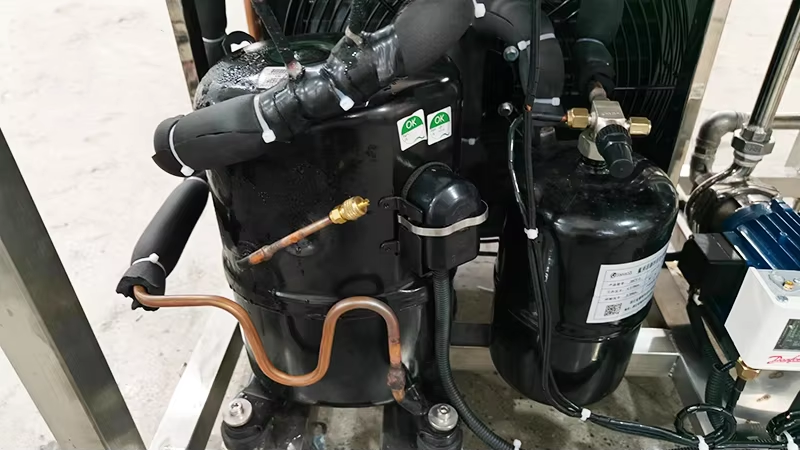 5. Freezing system: The machine adopts two-stage freezing system, the first layer is the freezing zone, connected with the freezing system. Another layerisfor the cold water frozen zone, access to cold water frozen. Equipped with chiller and cooler 1 set each, multi-stage working shares these refrigeration system.