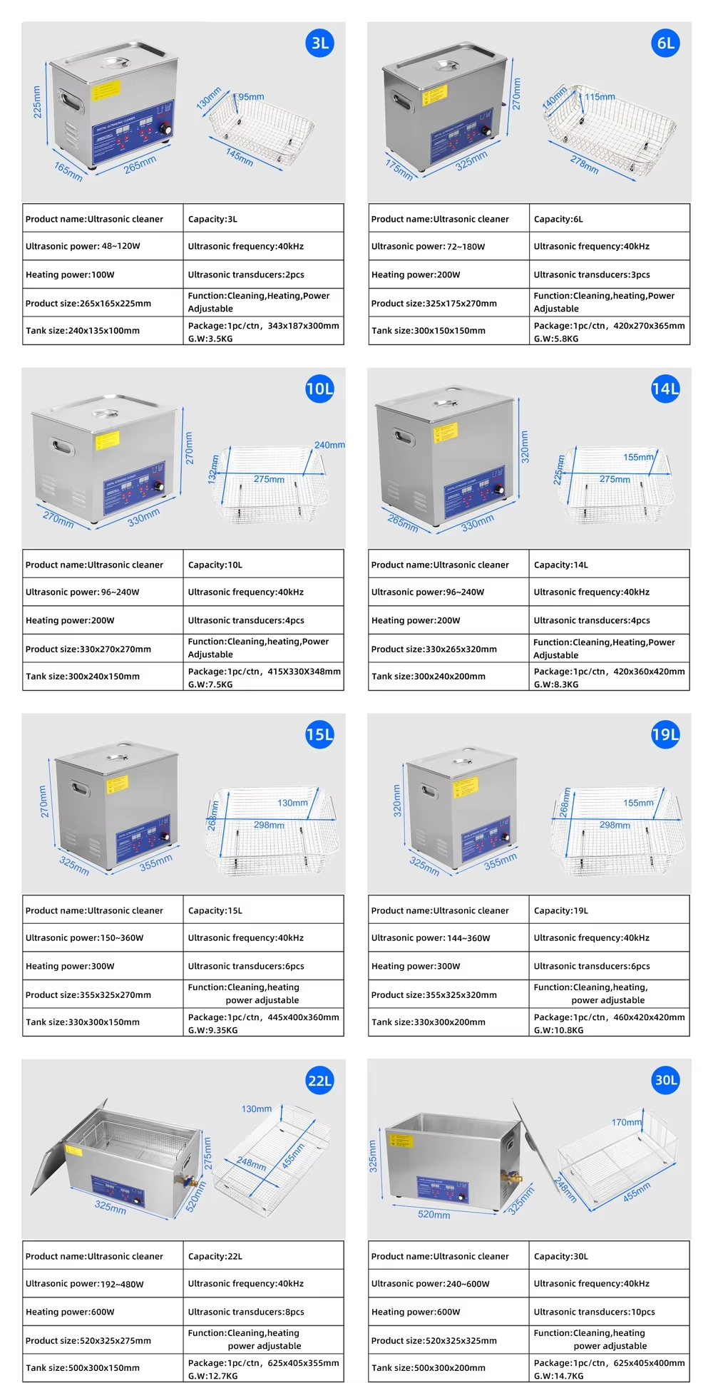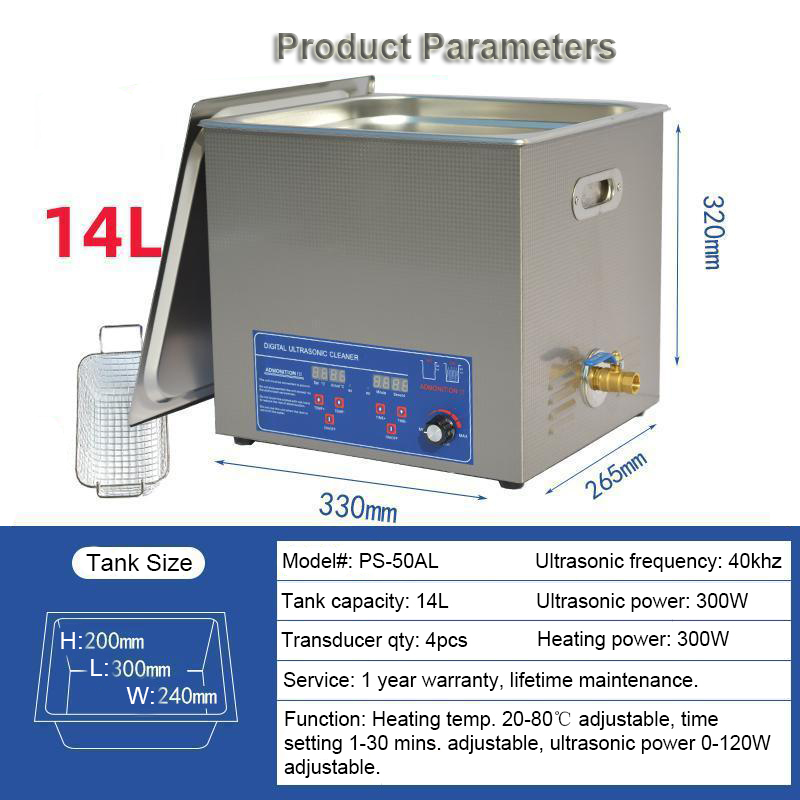 1. Tank capacity: 14L, tank size: L300*W240*H200mm, product Size: L330*W265*H320mm, package Size: L420*W360*H420mm, heating power: 200W, ultrasonic power: 96-240W adjustable, transducer quantity: 4pcs, frequency: 40khz.