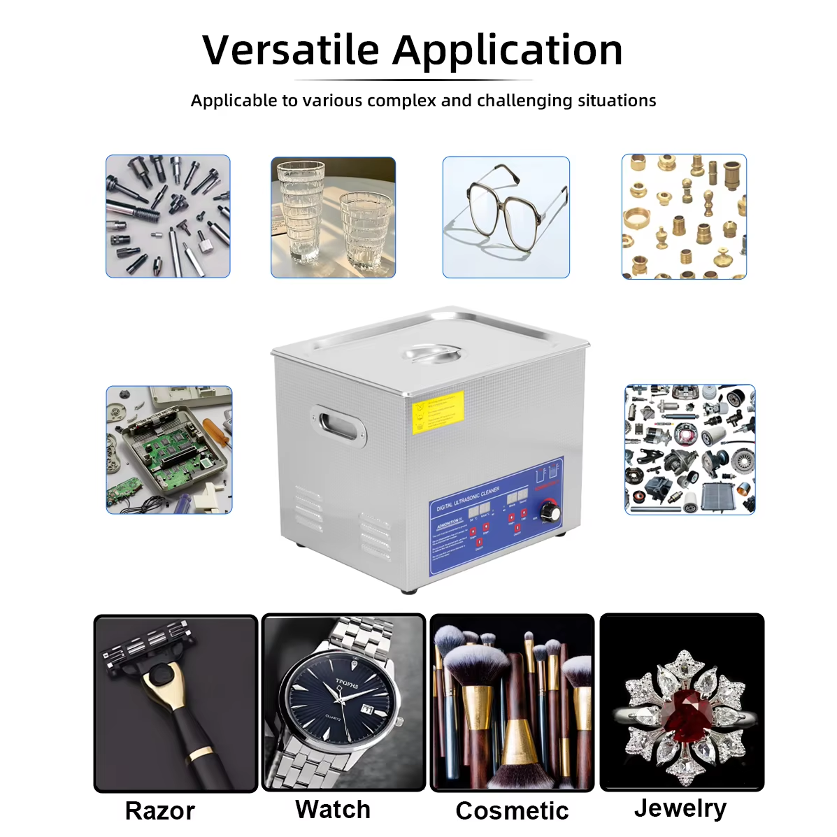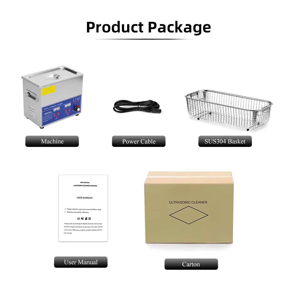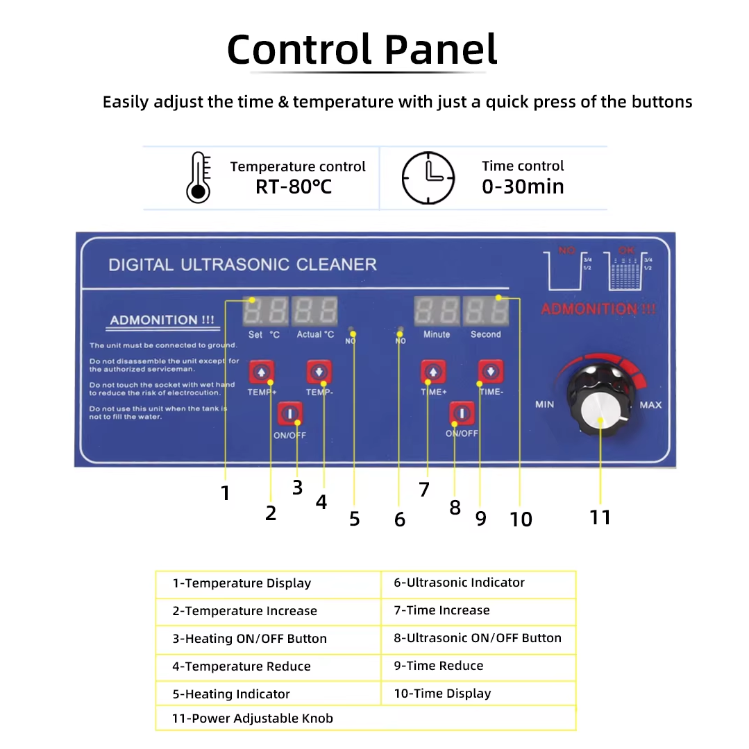 For this power adjustable series, the ultrasonic power is adjustable. You can simply turn the knob to adjust the ultrasonic power of the machine, it is very easy to operate. There is also digital control of timer and heater, you can set the time and temperature of the ultrasonic cleaning. Set a temperature slightly lower than your desired temperature if the heating and cleaning functions are to be active simultaneously, as there may be a slight temperature increase during ultrasonic cleaning. The actual temperature may be higher than the set temperature while the oscillation is in process. This is normal.