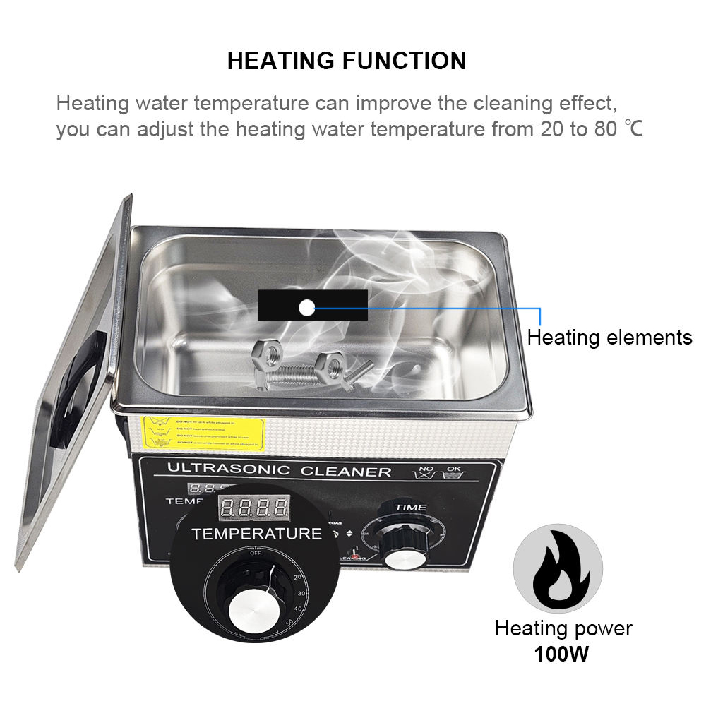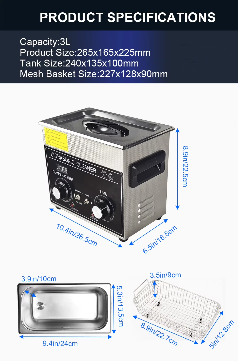 1. Tank capacity: 3L(0.8gallon), tank size: L240*W135*H100mm, product Size: L265*W165*H225mm, package Size: L343*W187*H300mm, heating power: 100W, ultrasonic power: 120W, transducer quantity: 2pcs, frequency: 40khz, with mechanical control timer and heater.