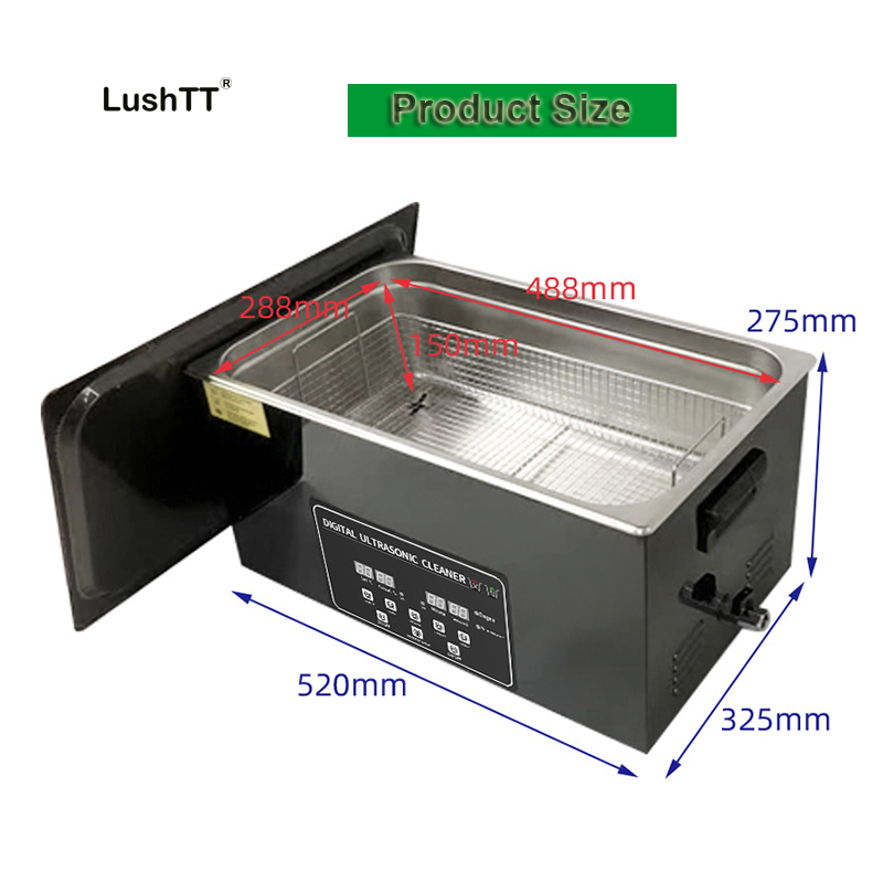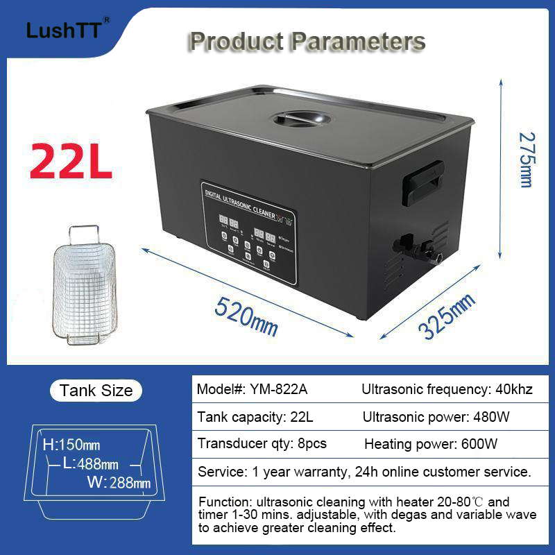 1. Tank capacity: 22L, tank size: L500*W300*H150mm, product Size: L520*W325*H275mm, package Size: L625*W405*H355mm, heating power: 600W, ultrasonic power: 480W adjustable, frequency: 40khz, with digital control timer and heater.