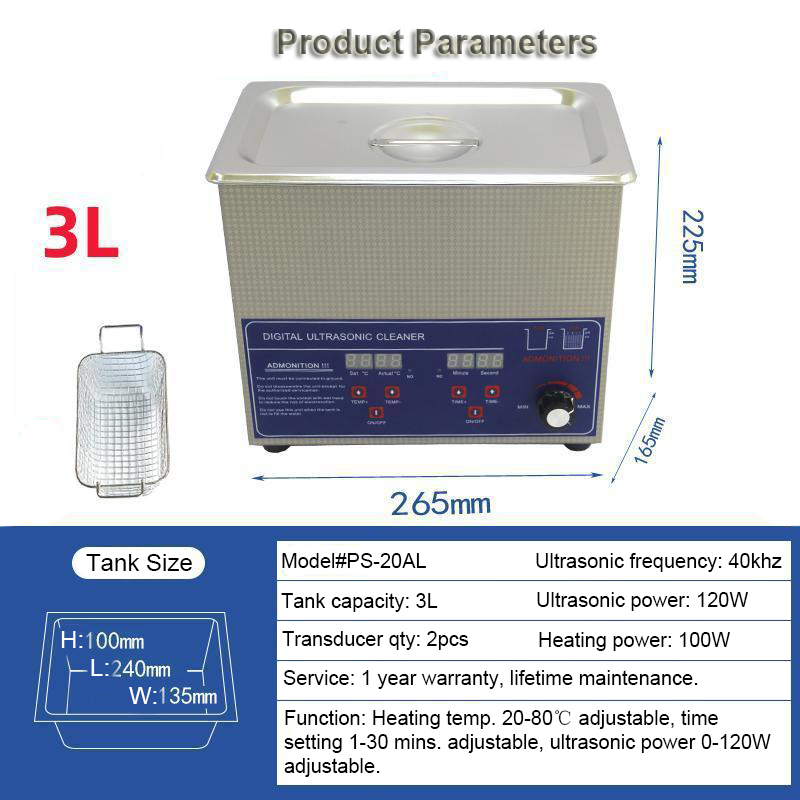 1. Tank capacity: 3L(0.8gallon), tank size: L240*W135*H100mm, product Size: L265*W165*H225mm, package Size: L343*W187*H300mm, heating power: 100W, ultrasonic power: 48-120W adjustable, transducer quantity: 2pcs, frequency: 40khz.