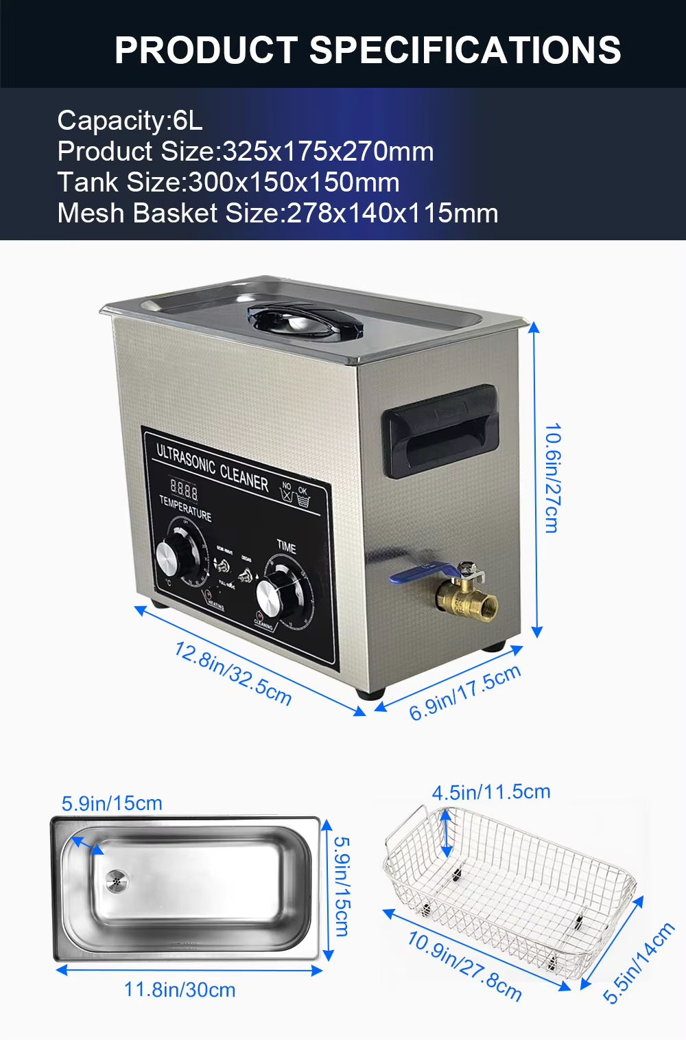 1. Tank capacity: 6L, tank size: L300*W150*H150mm, product Size: L325*W175*H270mm, package Size: L420*W270*H365mm, heating power: 200W, ultrasonic power: 180W, transducer quantity: 3pcs, frequency: 40khz, with mechanical control timer and heater.