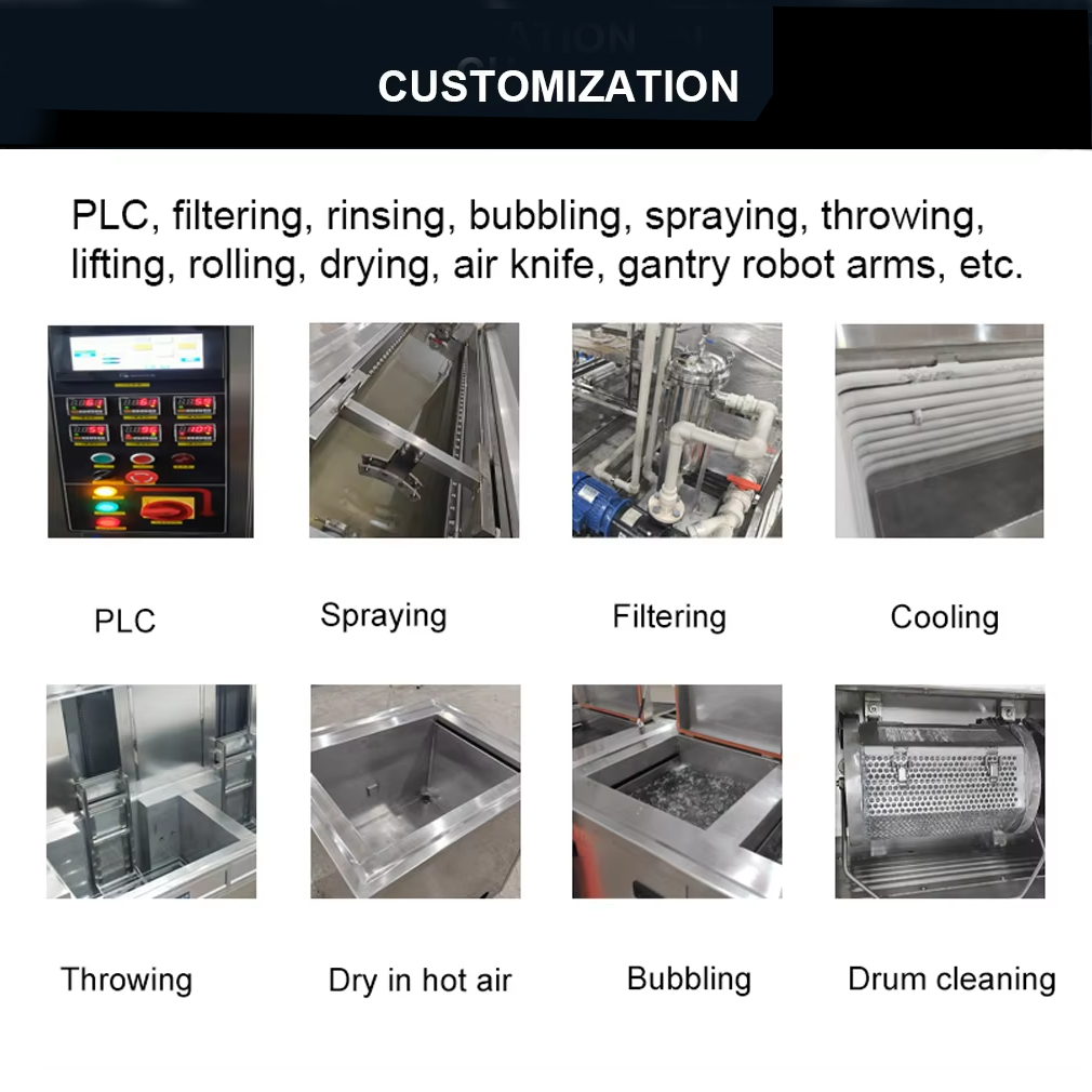2. Function: 1st tank ultrasonic cleaning (with filtration and recycling) + 2nd tank ultrasonic precise cleaning + 3rd tank spraying cleaning + 4th tank ultrasonic rinsing + 5th tank hot air circulation drying.