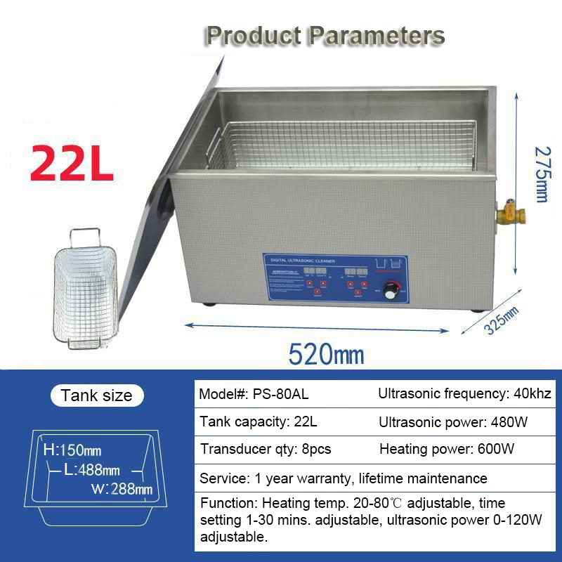 1. Tank capacity: 22L, tank size: L500*W300*H150mm, product Size: L520*W325*H275mm, package Size: L625*W405*H355mm, heating power: 600W, ultrasonic power: 192-480W adjustable, transducer quantity: 8pcs, frequency: 40khz.