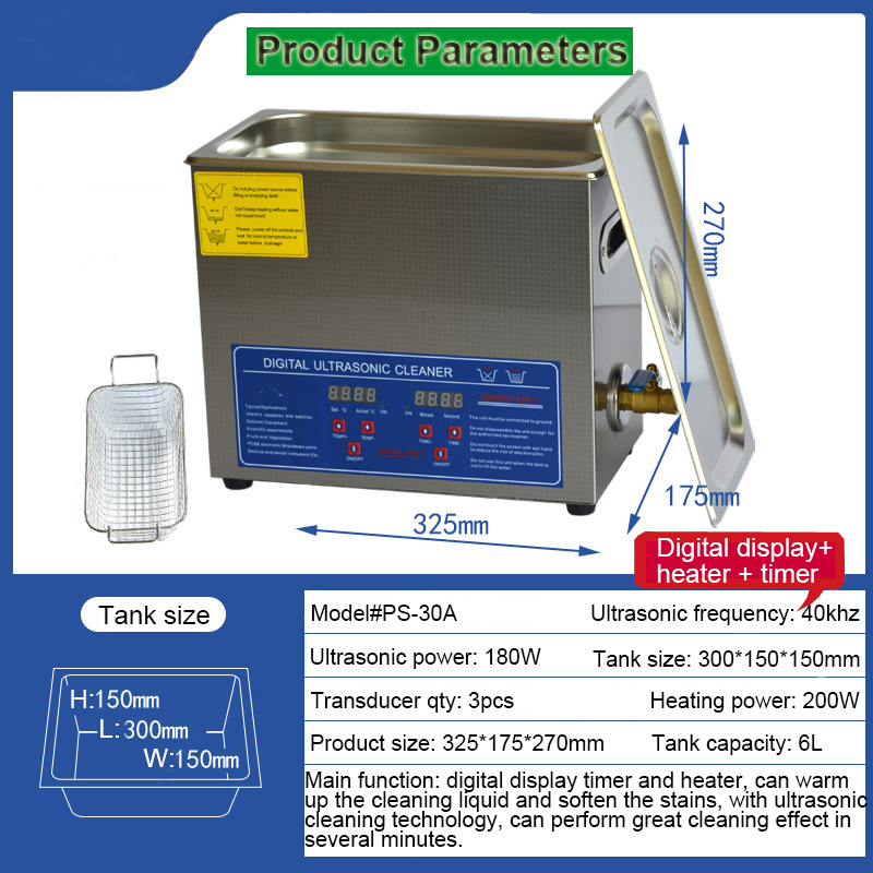 1. Tank capacity: 6L, tank size: L300*W150*H150mm, product Size: L325*W175*H270mm, package Size: L420*W270*H365mm, heating power: 200W, ultrasonic power: 180W, frequency: 40khz, with digital control timer and heater.